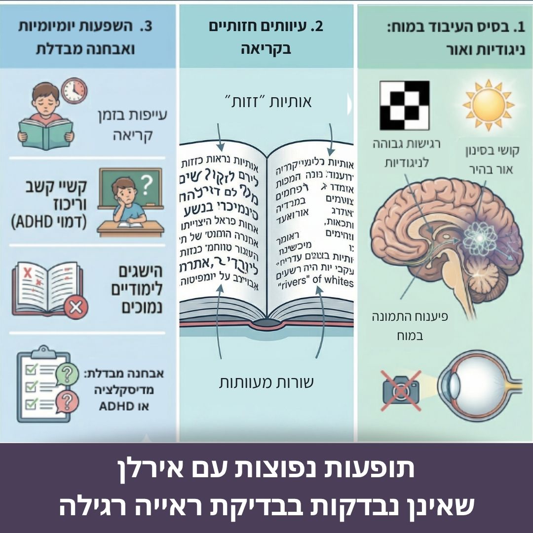 – תחושה שהאותיות זזות, קופצות, מיטשטשות או רקע בולט ומסנוור